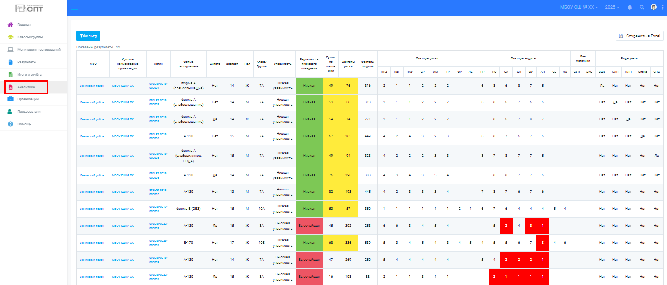 Данные из раздела «Аналитика» и результаты сортировки (фильтрации) можно выгрузить из системы СПТ в формате документа Excel. Для этого необходимо нажать на кнопку «Сохранить в Excel».