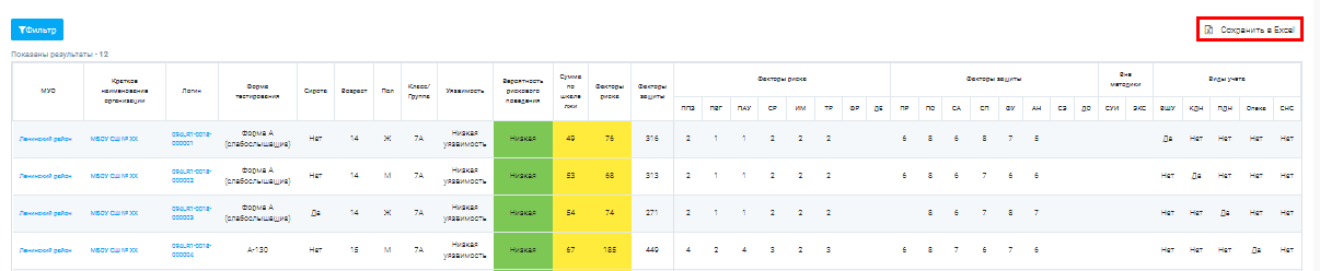 На странице вывода результатов доступны анкетные данные респондентов, их принадлежность к образовательной организации, форма тестирования, результаты определения вероятности рискового поведения, а также значения стэнов по каждой из шкал методики.