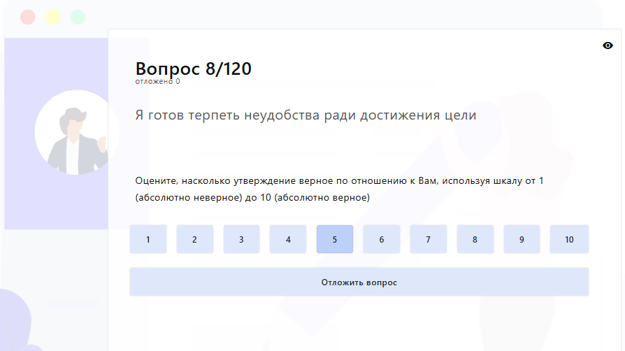 Все отложенные вопросы перемещаются в конец тестирования. На все отложенные вопросы необходимо будет ответить после того, как будет дана оценка оставшимся утверждениям. Для того чтобы перейти к отложенным вопросам, необходимо нажать на кнопку «Перейти к отложенным вопросам».