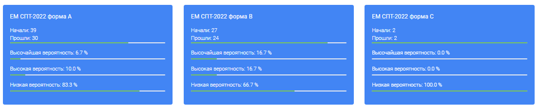 В разделе «Главная» пользователям также доступна статистика по прохождению тестирования по каждой из трёх форм (форма А, форма В, форма С) в информационных блоках, включающая в себя следующую информацию: