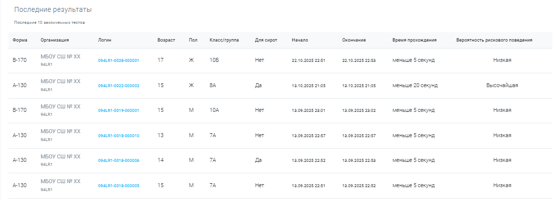 «Последние результаты» – это 10 последних законченных тестов. Статистика по параметру «Последние результаты» включает в себя следующую информацию: форма, организация, логин, возраст, пол, класс/группа, для сирот, начало, окончание, время прохождения, вероятность рискового поведения.