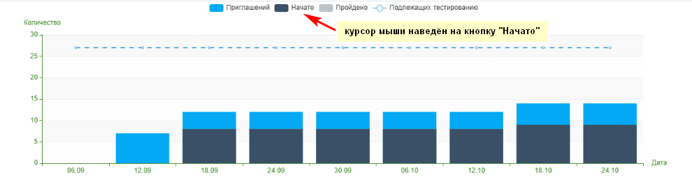 Каждой кнопке на графике «Количество/дата» соответствует цветовая особенность: «Приглашений» (голубой цвет), «Начато» (чёрный цвет), «Пройдено» (серый цвет), «Подлежащих тестированию» (линия на графике «-о-»). При наведении курсора мыши на любую из кнопок без нажатия на неё данные на графике, соответствующие кнопке, выходят на первый план.