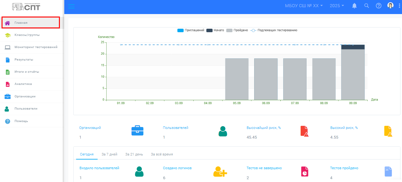 В системе СПТ в разделе «Главная» содержится общая статистика по прохождению тестирования в текущей и подчинённых организациях.