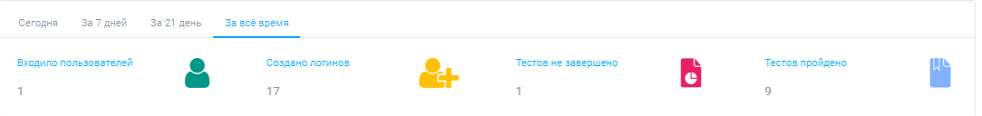 Также в разделе «Главная» пользователям доступна статистика по прохождению тестирования в виде следующих информационных индикаторов: