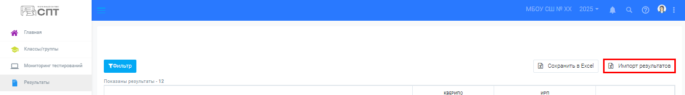 Для загрузки результатов тестирования в ПК СПТ пользователю необходимо перейти в раздел «Результаты» и нажать на кнопку «Импорт результатов».