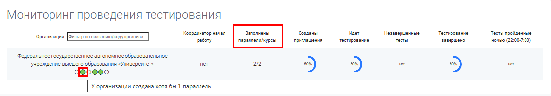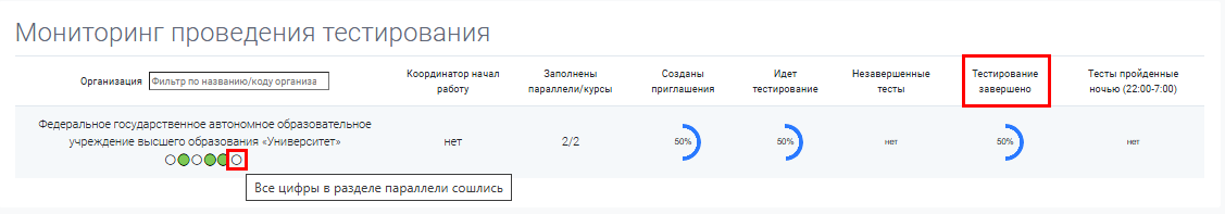 У каждой организации имеется своя шкала, которая показывает прогресс тестирования. Шкала заполняется по мере выполнения показателей. Значение окрашивается в зелёный цвет при выполнении условия, в противном случае остаётся пустым.