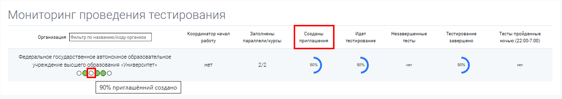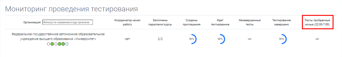 Раздел «Мониторинг тестирований» предназначен для отслеживания информации о ходе прохождения тестирования организациями.