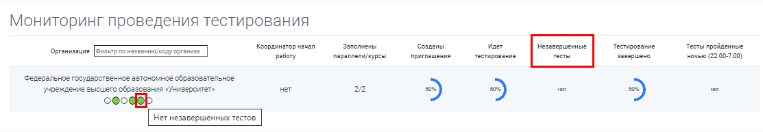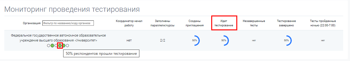 «Идёт тестирование»: данный показатель позволяет отследить началось ли прохождение тестирования респондентами в организации.